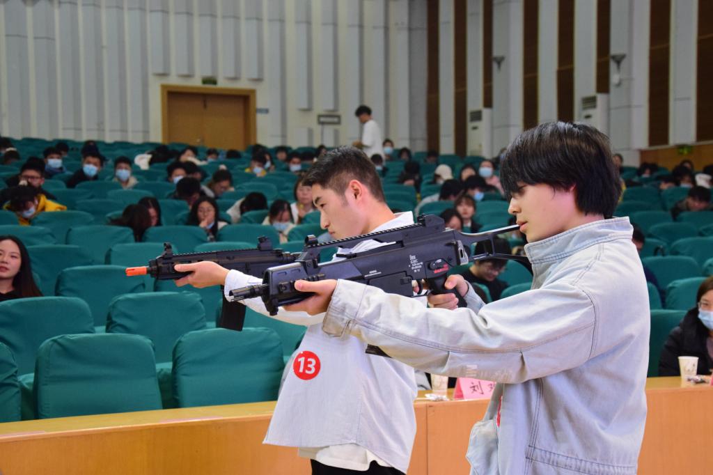 最后轮次为射击打靶。每位同学持水弹枪,站立在距墙壁3-5米远的地方射击标靶。在两轮比赛过后,根据成绩进行排名。最终,来自BEATS2020级公共管理类专业成豪杰同学取得了冠军。