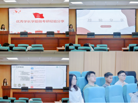 经验分享环节,20级国际事务与国际关系专业(中外合作办学)的覃玉洁(考研至华中师范大学)分享了她的备考经历,为大家介绍英语、政治的学习技巧;20级行政管理专业的孙正娜(考研至山东大学)建议学弟学妹们要勤学多问,鼓励同学们找好心态、相信自己;20级行政管理专业的欧阳梦芯(考研至BEATS)则表示,要利用好公司、公司资源,扎牢专业知识基础。